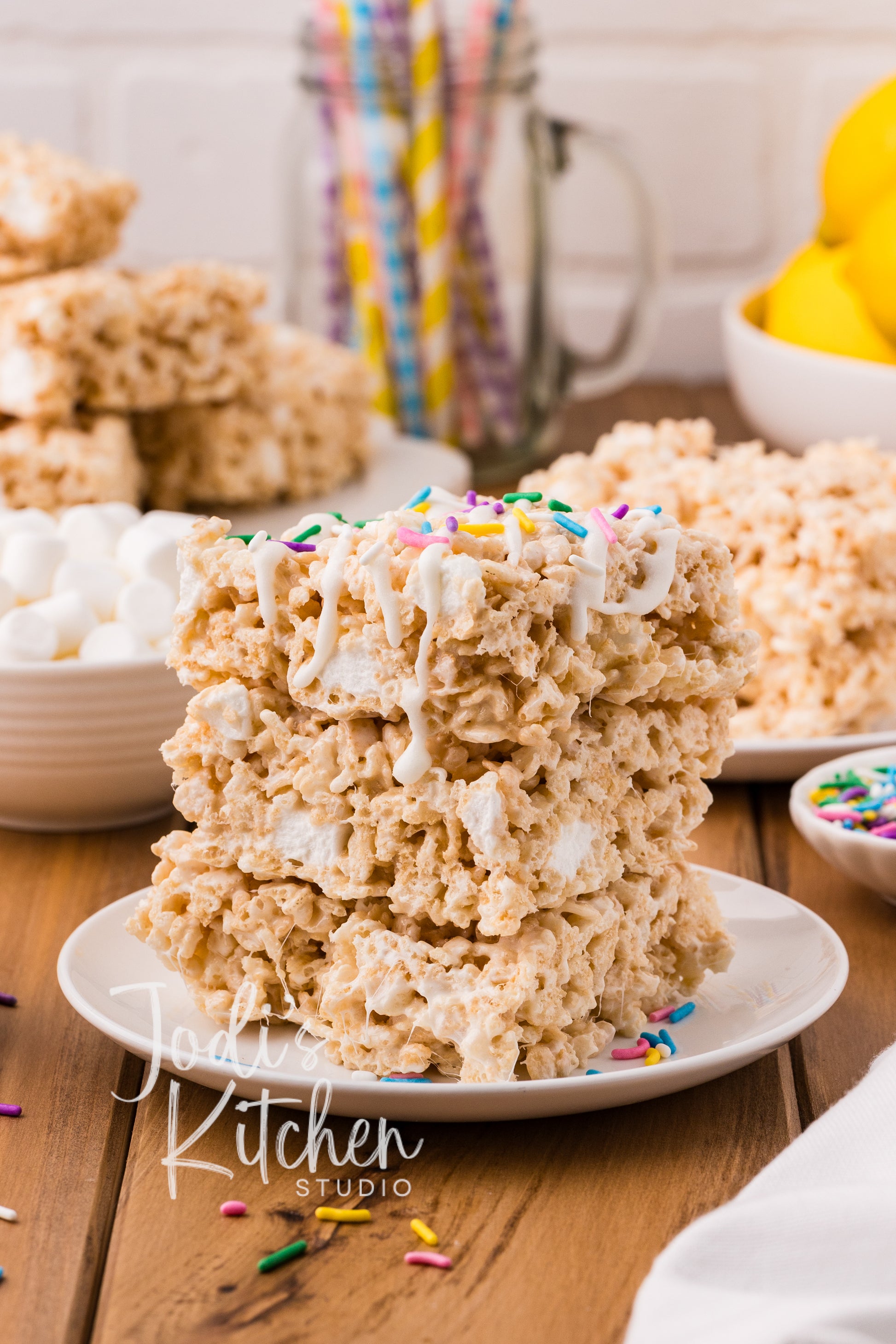 These Lemon Rice Crispy Treats are a fun twist on the classic treat. They combine the familiar buttery marshmallow base with a fresh burst of lemon, adding a light, citrusy pop to every bite. Soft, gooey, and full of flavor, they feel special without requiring any extra effort in the kitchen. Perfect for spring gatherings, casual get-togethers, or anytime you’re craving a simple dessert.