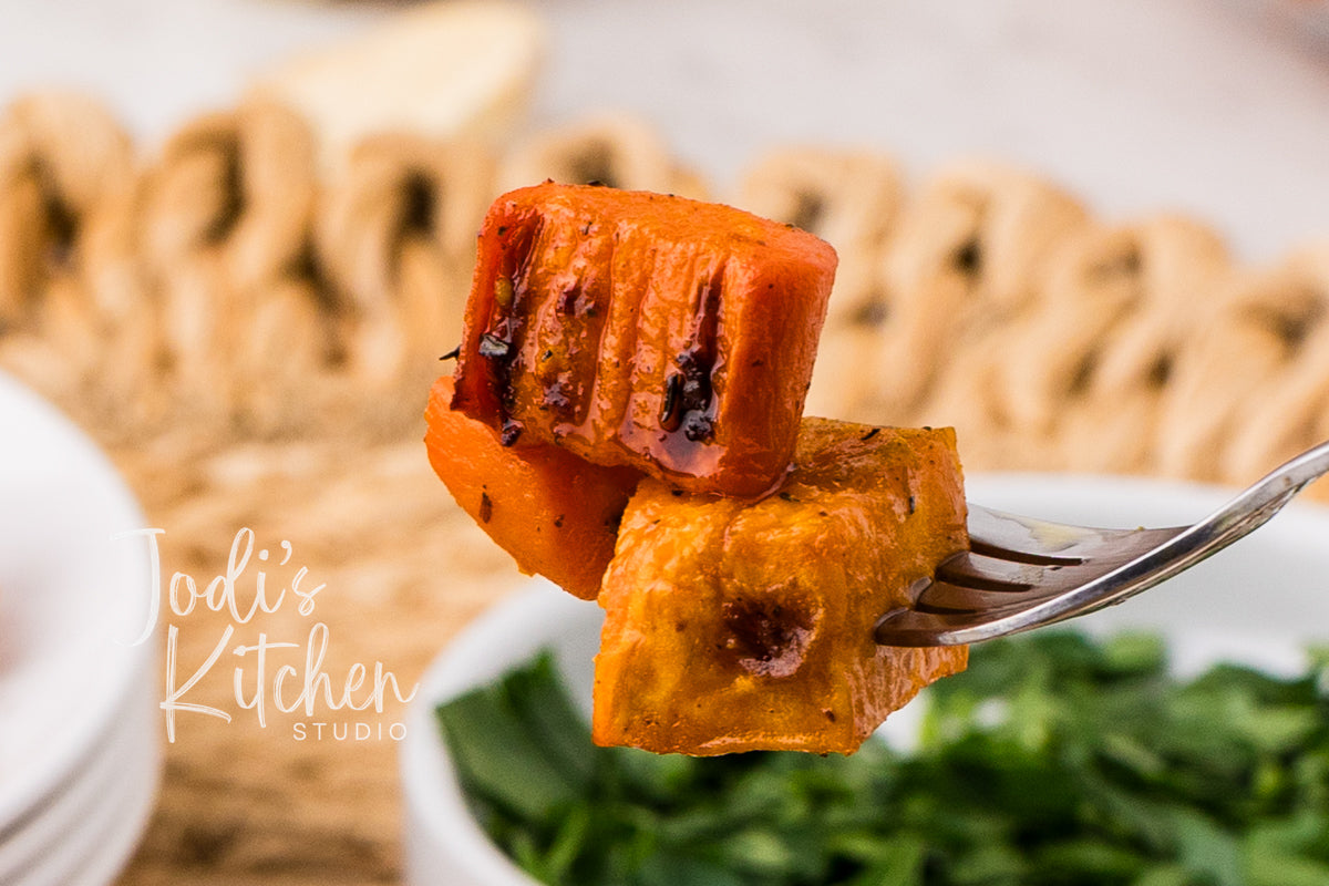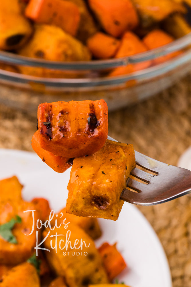 Ingredients: sweet potatoes, carrots, avocado oil, garlic, salt, pepper, thyme, smoked paprika